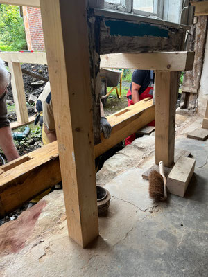 🔧 Als nächstes steht die Sanierung der Sockeloberkante an. Diese wird mit einer Horizontalsperre gegen aufsteigende Feuchtigkeit versehen, anschließend mit Ziegeln und Kalkmörtel abgeschlossen. Nach dem Trocknen können die Stützvorrichtungen entfernt und die Gefache wieder befüllt werden.