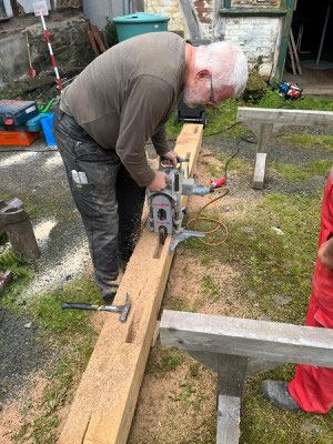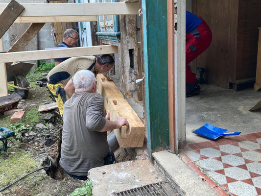 🛠️ Am vergangenen Samstag war es endlich soweit: Der marode Schwellbalken auf der Rückseite unseres Genossenschaftshauses wurde – nach Abstimmung mit der unteren Denkmalschutzbehörde – fachgerecht entfernt und durch einen neuen Eichenbalken ersetzt.