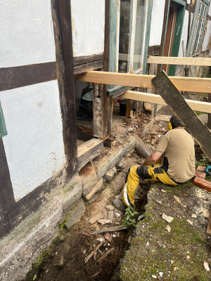 👷♂️ Die entscheidende Unterstützung kam von Axel Ditterich, Tischler und Schlosser aus Hannover, der seit Kurzem auch in Bad Grund lebt. Gemeinsam mit Zimmermann Thomas Rettstadt begann der Einsatz pünktlich um 9 Uhr. Bereits nach drei Stunden waren drei Gefache geöffnet, der alte Balken entfernt und der neue passgenau eingesetzt. Eine beeindruckende Leistung!